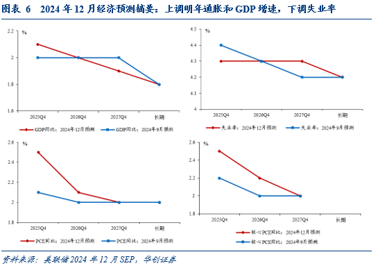 3、上调明年通胀和经济预测,下调失业率预测。通胀预测方面,此次将明年4季度的PCE价格指数同比从2.1%上调至2.5%,将核心PCE价格指数同比预测从2.2%升至2.5%。GDP增速和失业率预测方面,对明年4季度的实际GDP同比预测从2%上调至2.1%,对失业率的预测从4.4%下调至4.3%。