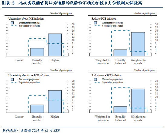 2、明年会继续降息但幅度削减,不太可能加息。明年为何继续降息?劳动力市场的下行风险似乎已经减弱,但仍然在逐渐降温,比疫情前更为宽松,“现在的就业创造远远低于或肯定低于维持失业率不变的水平”,所以“不需要进一步冷却劳动力市场来使通胀降低到2%”,并且“核心PCE通胀仍将下降”,但“政策仍然是限制性的(still meaningfully restrictive)”,因此需要继续降息。为何削减降息幅度?一方面是去通胀进程比预期的慢,明年的通胀预测更高,通胀风险和不确定性也更高;另一方面是目前“更接近于中性利率”,需要“保持谨慎”。明年不太可能加息,“似乎不是一个可能的结果”。