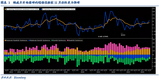 美联储在12月会议上如期降息25BP,但市场也将之理解为“鹰派降息”。“鹰派”的体现:一是,点阵图给出的明年降息预测为从4次降至2次,而市场交易(期货市场定价)和经济学家调查的预期是3次。二是,美联储官员对本月降息存在较大分歧,票委Hammack和其他3位没有投票权的参与者反对降息,支持维持利率不变。三是,彭博研究的文本分析显示,鲍威尔开场措辞的情绪指数较11月边际更为强硬。