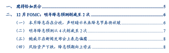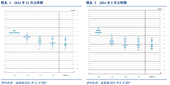 第三,会议声明暗示降息节奏将放缓,与近期美联储官员的公开表态契合(“目前已接近或处于放缓降息步伐的合理时间点”)。在会议声明中,将“在考虑对联邦基金利率目标区间进行额外调整(additional adjustments)时,委员会将…”修改为“在考虑对联邦基金利率目标区间进行额外调整的幅度和时间(the extent and timing of additional adjustments)时,委员会将…”;其余内容相比11月没有变化:经济“继续以稳健的速度扩张”,就业“自今年早些时候以来,劳动力市场状况普遍缓解,失业率有所上升,但仍处于低位”,通胀“在实现委员会2%的目标方面取得了进展,但仍然偏高”。