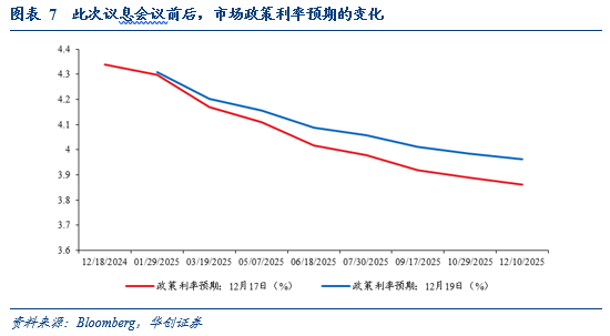 市场交易的降息预期向上修正。期货市场隐含的明年年末的政策利率从会议前的3.86%升至3.96%。