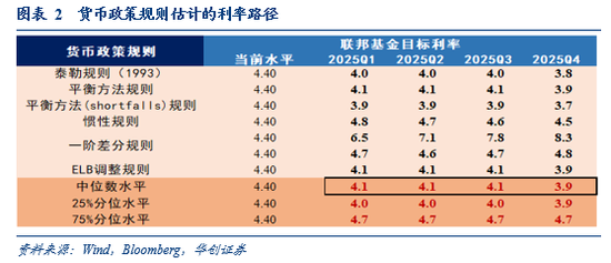 但如果从经济预测来看,点阵图给出的明年降息预测可能“鹰”得恰如其分。美联储此次将明年4季度的核心PCE价格指数同比预测从2.2%提高至2.5%,对失业率的预测从4.4%下调至4.3%,这一预测与彭博调查的市场预期完全一致。美联储不会严格按照货币政策规则的指引行事,但也会参考(关于货币政策规则,参见《美国降息的尺度》)。若按照货币政策规则,9月SEP给出的“2.2%核心PCE同比+4.4%失业率”预测组合,符合明年降息4次的点阵图预测;此次SEP给出的“2.5%核心PCE同比+4.3%的失业率”预测组合,也符合明年降息2次的点阵图预测。虽然官员们认为明年通胀风险和不确定性较高,但基于目前的基准情景,点阵图并未显示出“鹰派”,而是中性。