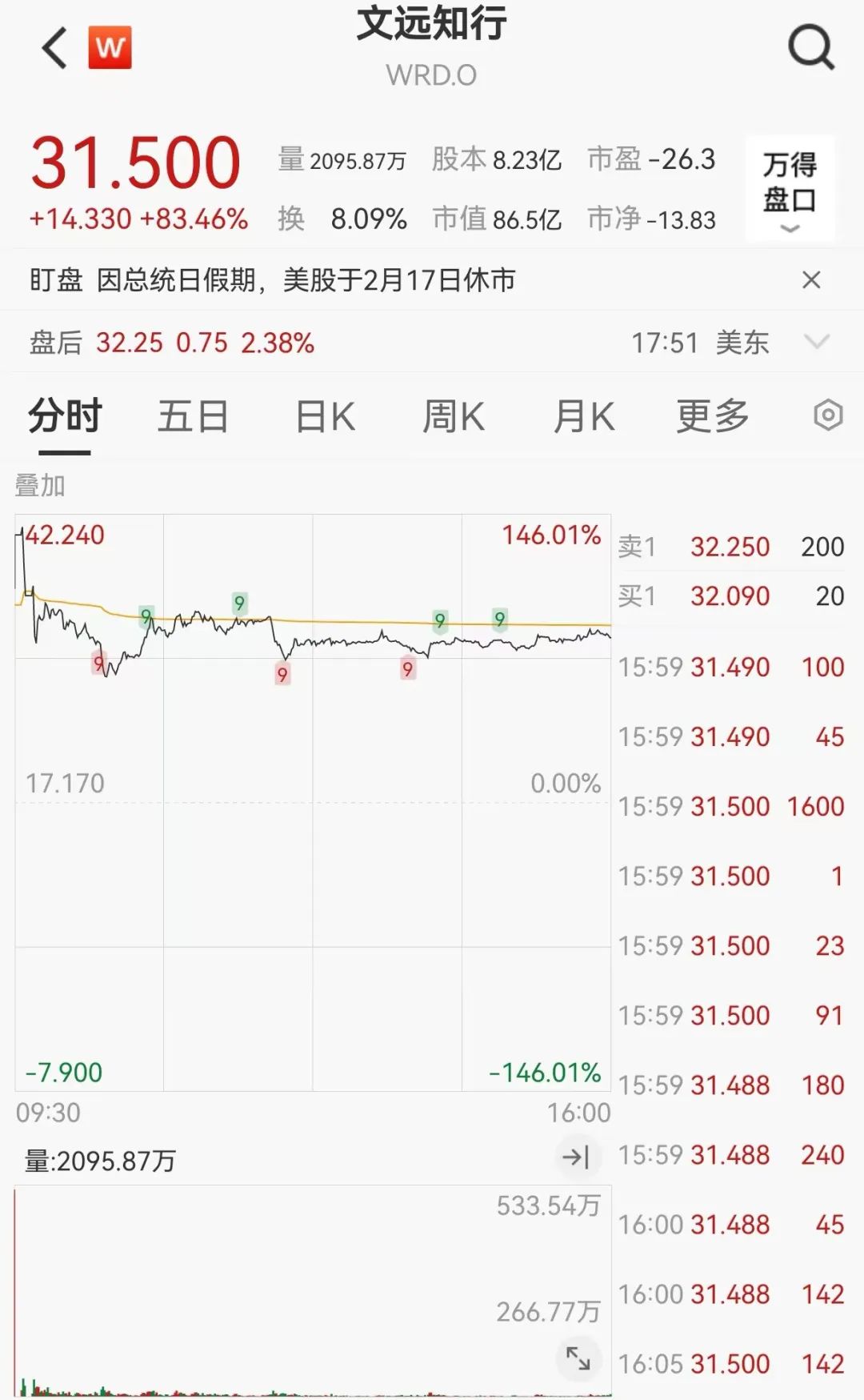 美东时间2月14日,英伟达披露持股文远知行。美股开盘后,美股文远知行一度大涨146.01%,盘中熔断,股价最终收于31.50美元/股,涨83.46%。